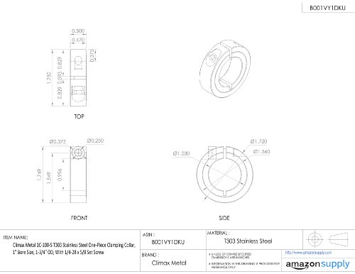 Climax Metal 1C-100-S T303 Stainless Steel One-Piece Clamping Collar, 1" Bore Size, 1-3/4" OD, With 1/4-28 x 5/8 Set Screw
