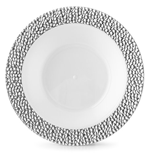Studio : Prestee Publisher : Prestee Product Description Add a touch of effortless elegance to your party table with these white plastic plates with silver pebbled border. Great for any type of formal occasion, including a bridal shower, wedding, dinner party, anniversary party, or black tie affair. These hard plastic plates feature a large surface area adding unique flair to anything you're serving, and the depth of the plate helps contain sauces and dressings to prevent accidental messes. Conveniently disposable, be the guest after the affair, or hand wash and you'll be able to enjoy these reusable plastic plates for many special celebrations to come 0