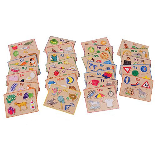 -. Feature : Each of the 26 wooden, inlay puzzles holds 5 easy-grasp, raised pieces focused on each letter of the alphabet / A matching picture and identifying name appears underneath / Each puzzle measures 6¾" x 8½" x 3/8" / Ages 3 yrs. +