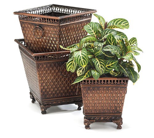 [Product Information]- Set of 3 Brown square tin planters with diamond design and claw feet. Handles on each side of planters
