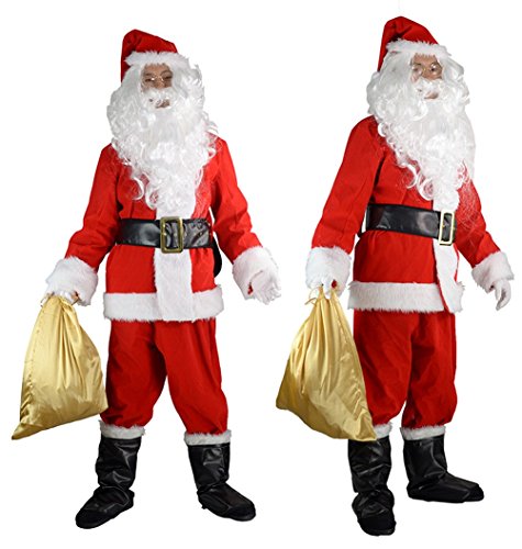 -. Feature : PACKAGE INCLUDES: This costume includes 10 pieces parts:Signature Santa Hat,Wig,Beard,Glasses,Red plush Santa Coat,Gloves,Belt with Buckle,Pants,Boot Tops with matching white plush Cuffs,Gold Gift Bag. / COMFORTABLE AND WARM VELVET: Our Santa Costume is made of high quality Velvet,which is lightweight,comfortable and warm,perfect to wear it for Christmas in winter. / HAPPINESS TO YOUR FAMILY: Santa Claus if the favourite of kids,wearing this suit, you are not just bringing them Christmas Presents,but also happiness,joy,laugh and good luck to your family. You will will find this investment is worthy. / OCCASIONS:It is perfect for any where on Christmas,Home,Supermarket promotions,Christmas Parties,just wear it on Christmas,you will be the happiness to everyone around you. / TOP QUALITY: Most of the costumes are only made for one-time wear, but this Santa suit is high quality, you'll be able to wear it Christmas after Christmas and it'll still seem totally new.