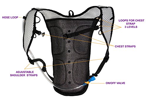 DESIGN: Hydration Backpack is Lightweight (0.670 lb) and includes 2 liter BPA-free water bladder. Exterior zipper pockets on sides helps you to stash your essentials such as: keys, energy bars, smartphone or wallet