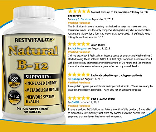 Give yourself increased energy, improved memory and stronger cognitive health. As we age, we begin to wear out and lose a bit of sharpness, which is especially true when it comes to our minds. We start forgetting things, we aren't as quick to react and we're more sluggish than not. But we can do something about it. BestVitality Natural Vitamin B-12 Dietary Supplement, a healthy way to improve your cognitive function, improve your energy levels and keep your mind sharp and ready for action. Our unique natural Vitamin B-12 formula is so powerful and so great for your body. And because it's made and packaged right here in the United States, you know you'll get a quality product, every time. Here are just a few more of the benefits BestVitality Natural Vitamin B-12 Dietary Supplement can offer you: • Boosts short and long-term memory • Increases alertness and focus • Safe, all-natural and organic • Promotes healthy brain function and blood flow • Improves energy and metabolismFeature
