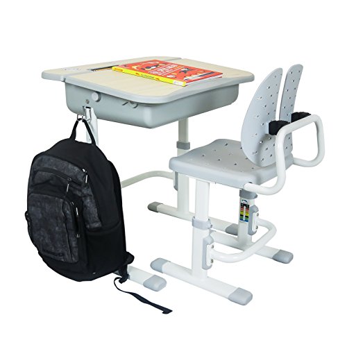 Adjustable height student school desk and chair combination with EASY Lift and Click Height Adjusters in Heavy Duty Steel Frame and ABS Plastic Top with faux Wood Finish. Chair and Desk Adjust up and down