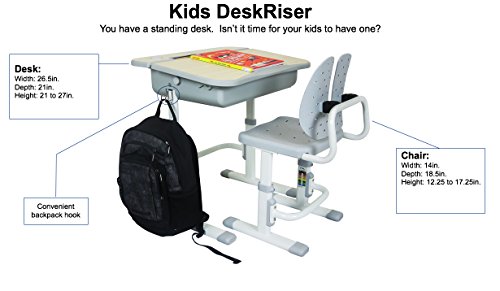 Overall kids standing desk dimensions: DESK: 26.5"W x 21"D x 21" to 27"H; CHAIR: 14"W x 18.5"D x 24" to 29"H; 12.25" to 17.25" Seat Height