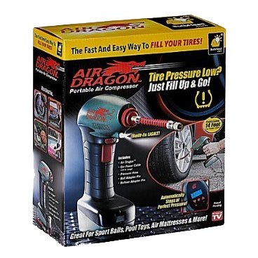 Studio : Telebrands Publisher : Telebrands Product Description Air Dragon Portable Air Compressor - As Seen On TV The Air Dragon is the fast and easy way to fill up your tires. The Air Dragon automatically stops at the perfect pressure. The Air Dragon has a built-in light. It's great for sport balls, pool toys, air mattresses more! It has an extra long 14 feet car power cable. Air Dragon includes: Air Dragon Car Power Cable (14 feet long) Pressure Hose Ball Adapter Pin Balloon Adapter Pin Simply plug the Air Dragon into your car's 12 volt outlet, check your car's PSI and set your Air Dragon to that number. Then fill up your tires and go! Air Dragon takes the fear and guesswork out of over-or-under-inflating your tires with its easy to use, auto-stop feature! The Air Dragon has the power to pump up all kinds of tires. It quickly inflates balls, pool floats, bicycles, air mattresses and more, so take yours home today! 0