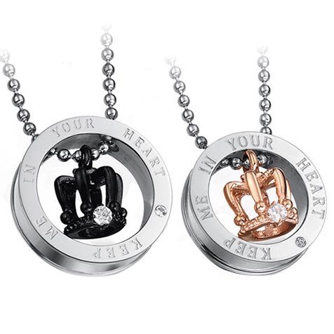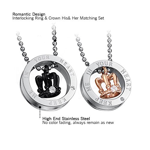 Cupimatch 2PCS Herren Damen Edelstahl Krone Ringe Anhanger Paar Halskette mit Gravur Strass , Weihnachten Valentine Geschenk 55cm Kette
