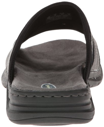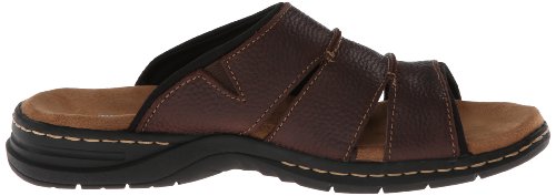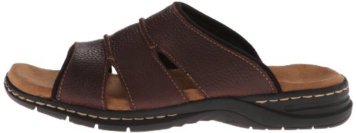 Slide sandal featuring trio of connected leather straps and padded memory foam insole