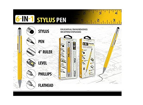 Six in one uses Functions as Touchscreen Stylus, Ballpoint Pen, 4" Ruler, Level, Screwdriver, and Flathead. This stylus pen glides effortlessly on the screen (No more smudges) Ballpoint pen ink cartridge can be refilled easily (Black ink included) Constructed with heavy durable silicone touchscreen sensitive tip Can be used with any touchscreen device such as tablets, phones, GPS