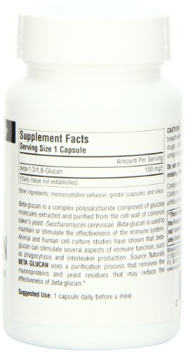 ReleaseDate : 2006-06-21 Studio : Source Naturals Publisher : Source Naturals Binding : Health and Beauty Product Description Dietary supplement. Purified Beta -1.3/1.6 - Glucan. Beta Glucan is a complex polysaccharide composed of glucose molecules extracted purified from the cell wall of common baker's yeast, Saccharomyces cerevisiae. Beta glucan is used to maintain or stimulate the effectiveness of immune system. Animal human cell culture studies have shown that beta glucan can stimulate several aspects of immune function, such as phagocytosis interleukin production. Source Natural's Beta Glucan uses a purification process that removes the mannoproteins yeast residues that may reduce the effectiveness of Beta Glucan. (These statements have not been evaluated by the FDA. This product is not intended to diagnose, treat, cure, or prevent any disease). Contains no dairy, egg, gluten, corn, soy or wheat. Contains no starch, salt, preservatives, or artificial color, favor or fragrance. 0