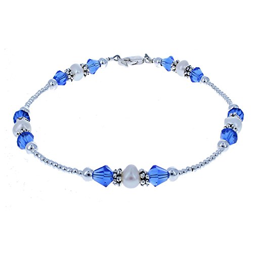 Genuine Fresh Water Cultured Pearls, Blue Czech Fire Polished Glass & Sterling Silver Beads Ladies Beaded Gemstone Anklet, Available Lengths: 9" - 12" (Lobster Clasp, Jump Ring, Crimps & Beads - .925 Sterling Silver) (Daisies Only - Silver Plated Base Metal)Feature