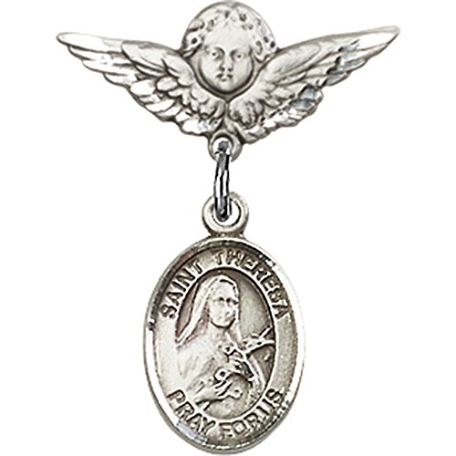 -. Title : Sterling Silver Baby Badge with St. Theresa Charm and Angel w/Wings Badge Pin 7/8 X 3/4 inches