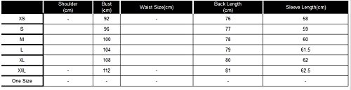 Size Details: Size:S Bust:92cm/36.2" Sleeve:58cm/22.8" Back Length:76cm/29.9" Size:M Bust:96cm/37.7" Sleeve:59cm/23.2" Back Length:77cm/30.3" Size:L Bust:100cm/39.3" Sleeve:60cm/23.6" Back Length:78cm/30.7" Size:XL Bust:104cm/40.9" Sleeve:61cm/24" Back Length:79cm/31.1" Size:XXL Bust:108cm/42.5" Sleeve:62cm/24.4" Back Length:80cm/31.4" Size:XXXL Bust:112cm/44" Sleeve:63cm/24.8" Back Length:81cm/31.8"