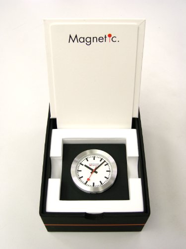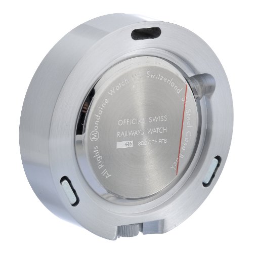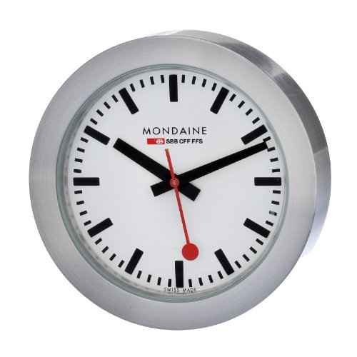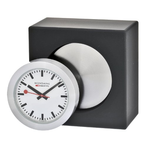 Mondaine Quartz Analog Shelf Clock - Black ion-plated stainless steel case. Fixed white bezel. White dial with black hands and index hour markers. Minute markers around the outer rim. Dial Type: Analog. Swiss quartz movement. Scratch resistant mineral crystal. Case diameter: 49 mm. Case thickness: 12 mm. Round case shape. Mondaine Quartz Analog Shelf Clock 6603031884SBB.Feature