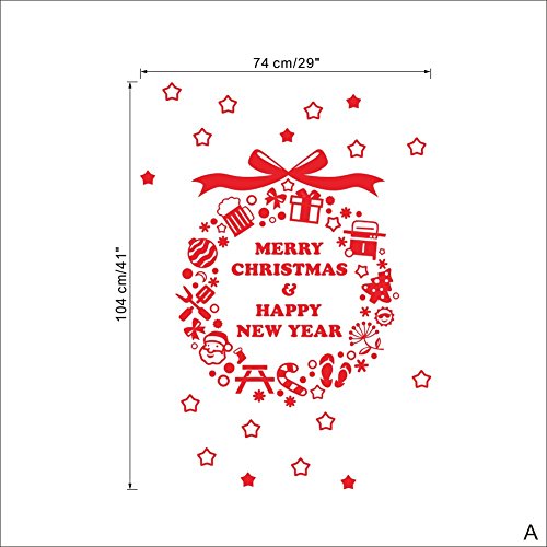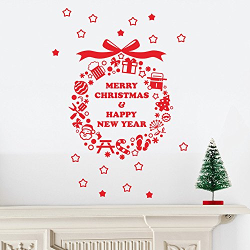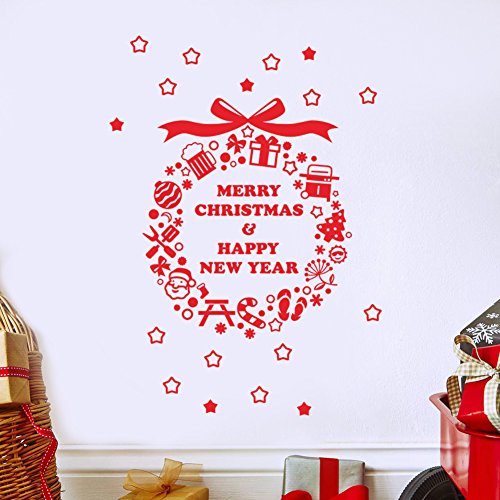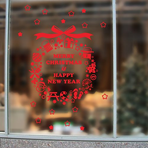 -. Title : BIBITIME Red Saying Merry Christmas & Happy New Year Wall Sticker Wreath with Star Ball Knife Fork Cane Snowman Tree Window Snowflakes Decor