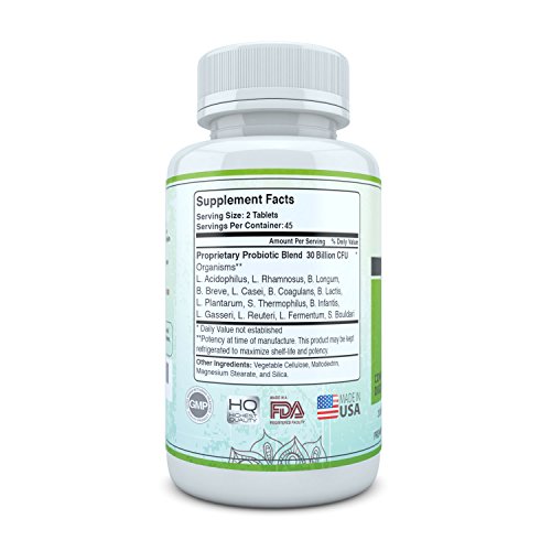- Feature : BETTER DIGESTION FOR BETTER HEALTH - Good bacteria in your gut promote a healthy digestive system and reduce gas, bloating, indigestion and constipation / MORE ENERGY AND BETTER MOOD - Digestive problems interfere with everyday life. Having a better balance between the good and the bad bacteria in your stomach allow for better digestion and absorption of nutrients by your body. No more lethargy because of a bad gut and you will feel your energy levels go up too because all the good stuff from what you eat will be absorbed by your body / COMPLETE DIGESTIVE HEALTH - With 15 different strains of good bacteria PROBIOTIC-30 is the best probiotic supplement you can get on the market today. Our proprietary formulation ensures you get the benefits of good bacteria 24/7 / EASY TO SWALLOW - Just take two small tablets a day and you're done for the day. No big capsules to swallow, just those little guys and your gut is protected from bad bacteria / BEST QUALITY MADE IN THE USA - We are proud to offer the highest quality ingredients made in an FDA registered facility. Your health matters to us, our facilities are FDA regulated and we follow GMP guidelines so you can be confident you're taking only the highest quality ingredients providing the optimum goodness for your body. We have a strict 100% Customer Satisfaction Guarantee.