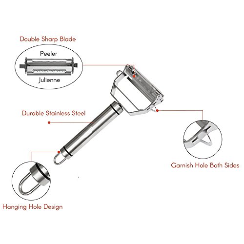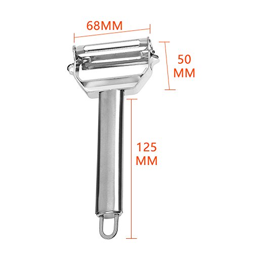 - The Peeler is made of high quality stainless steel, fine polishing, oxidation resistance, corrosion resistance, not easy to rust, durable! It Is a good helper for your kitchen cooking! The stainless steel blades are crafted to be effective and safe. The ultra-sharp dual blades make it easy to tackle any tough fruit or vegetable, like a pumpkin or butternut squash! Peeling and shredding has never been so easy