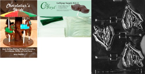 Cybrtrayd 45stK25GRBk-C040 Santa Face Lolly Chocolate Mold with Chocolatier's Bundle of 25 Lollipop Sticks, 25 Cello Bags, 25 Green Twist Ties and Chocolatier's Guide
