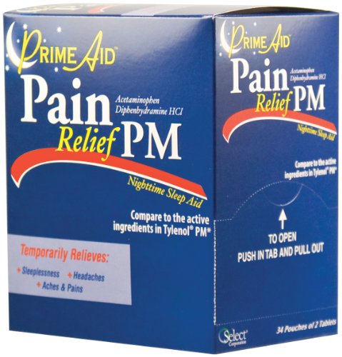 -. Binding : Health and Beauty -. Feature : Temporarily relieves occasional headaches with minor aches & pains, and occasional sleeplessness. / Temporarily relieves itchy eyes and runny nose associated with common allergies and hay fever. -. IsAdultProduct : 0 -. Label : PRIME AID -. Manufacturer : PRIME AID -. PackageQuantity : 34 -. ProductGroup : Health and Beauty -. ProductTypeName : HEALTH_PERSONAL_CARE -. Publisher : PRIME AID -. Studio : PRIME AID -. Title : Prime AID Pain Relief Pm Nighttime Sleep Aid - 34 Pouches of 2 Caplets