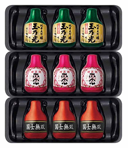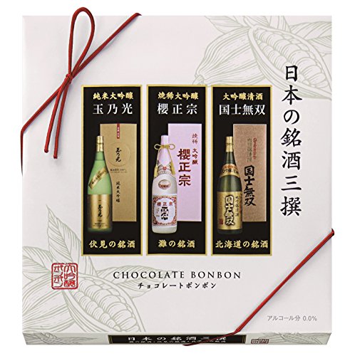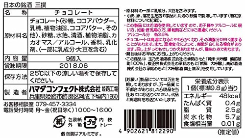 原材料:チョコレート(砂糖、ココアパウダー、乳糖、植物油脂、ココアバター、その他)、砂糖、水飴、清酒、植物油脂、カカオマス/アルコール、香料、乳化剤、(一部に乳成分・大豆を含む)