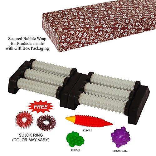 - Feature : **IMPORTANT NOTE** - The images and page information for this product have been created by 'Super India Store'. You will get exactly what you see only if you order from Super India Store. / **FREE Gift Box Packaging worth $1.99 as shown in image with secured "Bubble Wrap" for Product inside. / **PLEASE CONFIRM** Original Seller "Sold by Super India Store' and Fulfilled by Amazon" before you add it to the cart. Genuine Super India Store. product - beware of imitations! / ***FREE 2 SUJOK RINGS WORTH $3.99, FREE 1 ACUPRESSURE K-ROLL WORTH $4.99, FREE 1 ACUPRESSURE SUJOK BALL WORTH $3.99, FREE 1 ACUPRESSURE THUMB WORTH $3.99, FREE REFLEXOLOGY CHART FOR HANDS & FEET WORTH $2.99 (TOTAL FREE Nos. 5 ACUPRESSURE HEALTHCARE PRODUCTS WORTH APPROX. $20.00) ***The acupressure massager is truly relaxing and well built. / ***Easy to use simultaneously for both the feet. It has three spiked bars for each foot to apply pressure. ***It is best to apply acupressure to feet because all nerves points are there. ***It is an ideal gift item for health conscious people. Secured Bubble Wrap for Product inside with Gift Box Packaging worth $2.99
