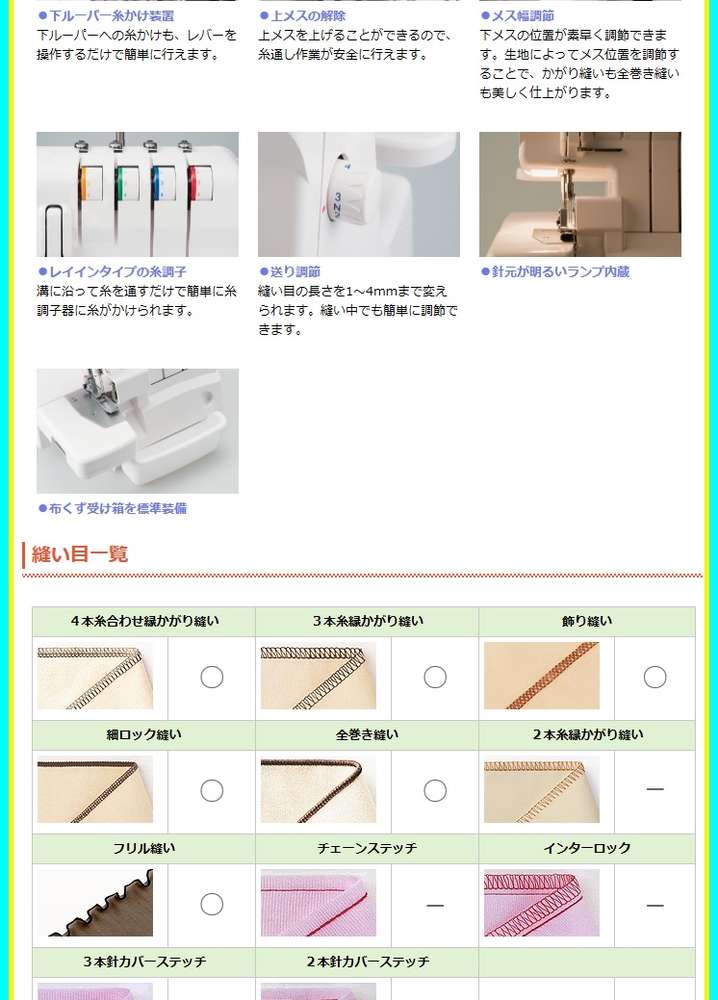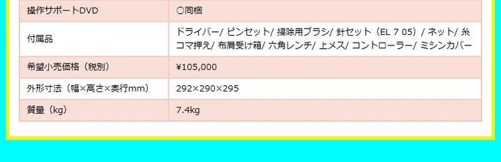 ●付属品:ドライバー/ピンセット/掃除用ブラシ/針セット(EL705)/ネット/糸コマ押さえ/布屑受け箱/六角レンチ/上メス/コントローラー/ミシンカバー