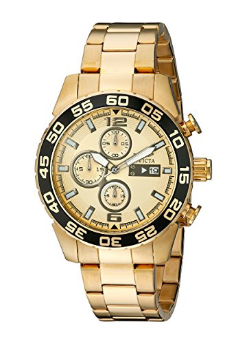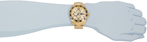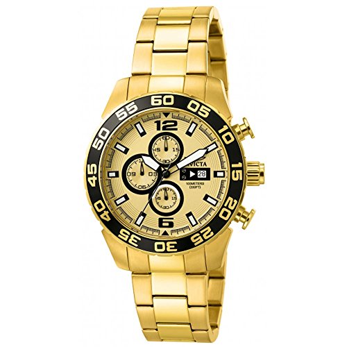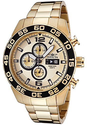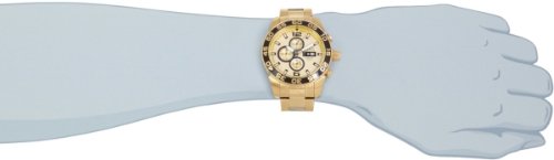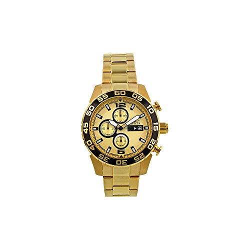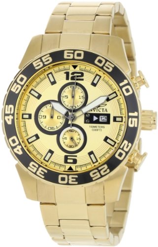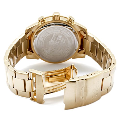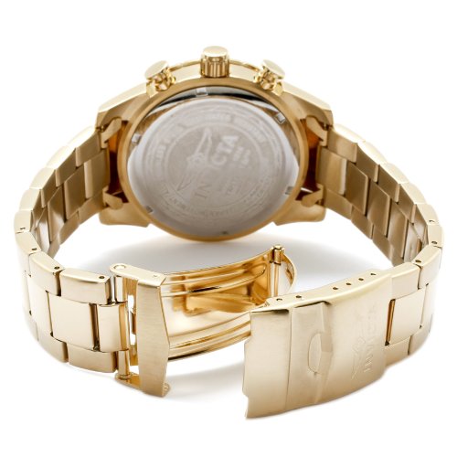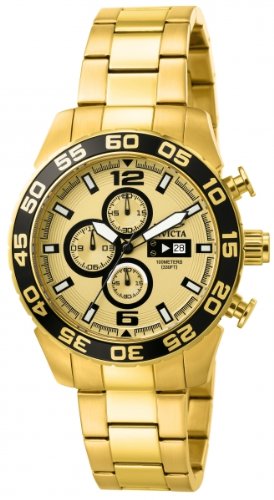 Studio : Invicta Publisher : Invicta Binding : Watch Amazon.com The versatile style of the Invicta Men's II Collection Chronograph Gold-Plated Stainless Steel Watch lends an attractive accent to your daily wardrobe whether your business is dressed up or more casual. This watch features a round brushed-and-polished 18k gold-plated stainless steel case with a black unidirectional bezel. The gold dial displays luminous black hour, minute, and second hands, an Arabic numeral at the six and twelve o'clock hours, and black luminous indices at each remaining hour. This attractive timepiece displays a date window at the three o'clock hour. The three chronographic subdials feature 60-second, 60-minute, and 12-hour functions. An 18k gold-plated stainless steel band fits comfortably and securely fastens by a fold-over clasp with safety. This timepiece offers reliable Japanese quartz movement and is protected by a durable flame-fusion crystal, along with water-resistance to a depth of 330 feet (100 meters). II Collection In the wake of up to the minute technology, optimal construction, and a spectrum of inventive design choices you will find the Invicta II collection. Priced to demand attention, no technological or creative rock has been left unturned in order to create such an impeccable example of the ultimate in function and fashion. Invicta II offers a myriad of enticing options including applied indexes, up markers, double-dial dual timers, leather straps, carbon-fiber dials, retrograde chronographs, and moon phase registers. Having fused brains and good looks at a stellar price, the Invicta II is the perfect collection to indulge in all your watch fantasies. 0