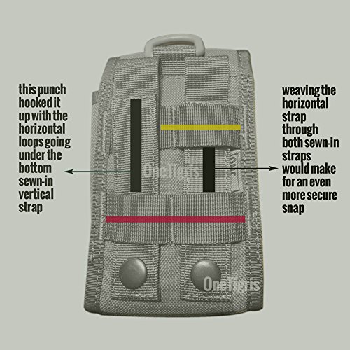 -. Feature : Designed to hold smartphone with big screen. FYI: Fit iPhone 6 Plus itself perfectly, with an otter box defender case would fit so tightly, a slim case is fine.Please compare your tech size before order. / Constructed of red 1000D nylon with padded interior and strengthened buckle / llow for attachment of various MOLLE-compatible backpack pouch or vest / Can also be worn horizontally or vertically on belts. About the Problme of crappy snaps: There are loops under the molle strap sewn to the case,make the strap go though loop before getting close or look up how to intall onto webbing / Approximate Dimensions: 6.3"(H)*3.6"(W) , adjustable Height