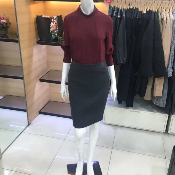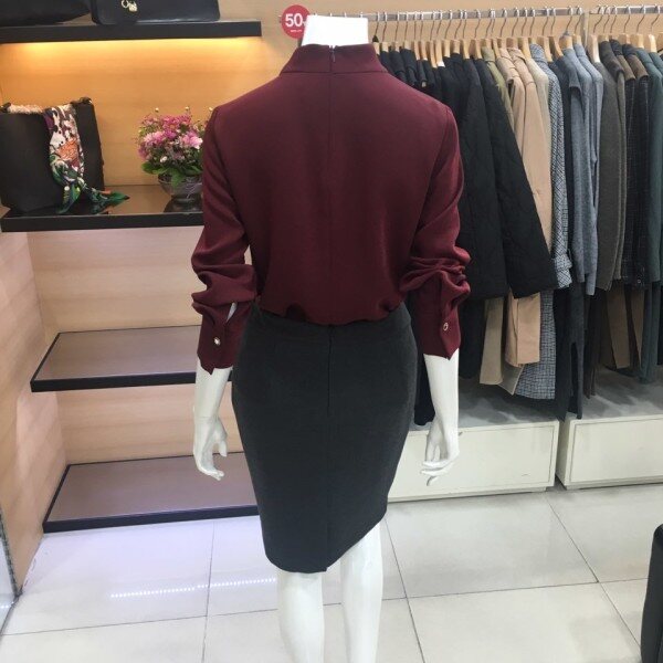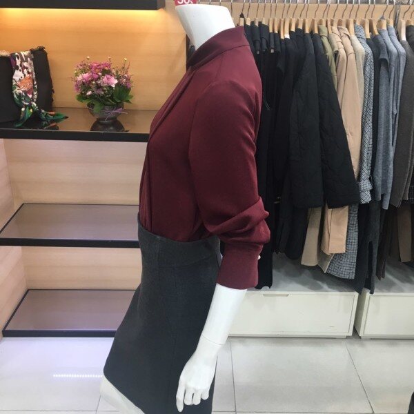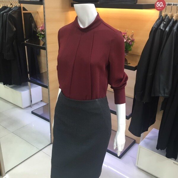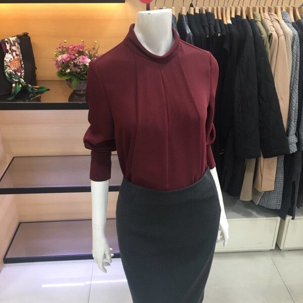 쉬즈미스 목이 올라오는 하이넥의 블라우스예요 뒷지퍼로 되어있어서 착용하기에 편하며 폴리소재로 가볍고 부드러운 터치감과 쾌적한 착용감을 느낄수 있어요