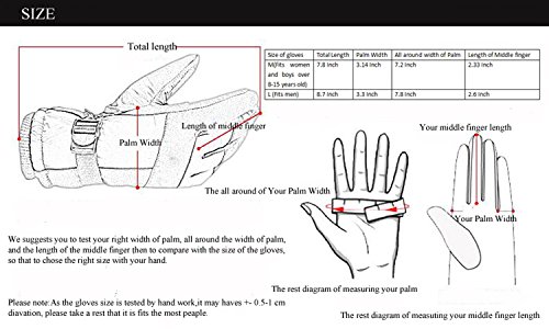 -. Feature : KEEP YOU HAND IN WORM RANGE OF ZERO -22°F TO -4°F-The high-quality cotton insulation with the thicken smooth fleece inside keep your hand warm effectively. / WATERPROOF-The surface layer waterproof material use the LOTUS LEAF waterproof technology makes the water condense automatically when dripping, so that the water would not soaked the gloves. Off course, you can not put the gloves into the water for long time. / TWO SIZE FOR CHOSE, M AND L- The M size is suitable to the boys from 8 to 13 years old and most women hands. The L size is suitable for the most of men hand. The wrist button can change the little size of the gloves, so do not worry about the size if your hand is a little large or small. / ANTI-SKID WEAR. The high quality PU in the plam make you safety when you cycling and snowboarding. The all cover PU in the plam also make it waterproof effectively. Even your hand grip the snow for long time, the melting snow would not soaked the gloves and still keep your hand and finger warm effectively. / 100% MONEY BACK GUARANTEE - We offer a 100% money back guarantee on all of our gloves. If you are not happy with the gloves, we will provide a full refund with no questions asked. ✔ ✔ ✔ Genuine Item is shipped & sold only by DUZCLI or Fulliment by AMAZON