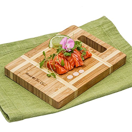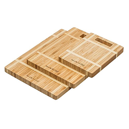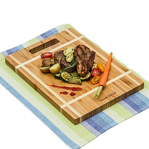 - MODERN TWO TONE DESIGN - The board’s stylish two tone design looks great in any kitchen or cooking space, a chopping board made of bamboo is harder than maple, oak, wood cutting boards at a fraction of the price. HANDLES THE SHARPEST CUTTING BLADE Our cutting boards handles the sharpest Japanese / German blades with damaging their edges. 100 % Satisfaction Guarantee 30 Day Money Back. If for any reason you are not 100% satisfied with your cuttingboards we will gladly give you your money back!