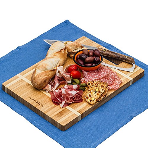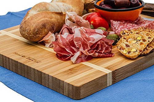 - MULTIPURPOSE BUTCHER OR CHOPPING BLOCK - Uniquely engraved 100% totally bamboo these high quality cutting boards are the perfect size as they occupy minimum space on your counter or over your sink yet are big enough for all your chopping needs. The uniquely engraved white lines add a modern touch and compliment your kitchen decor. IDEAL SURFACE FOR FOOD PREP - BAMBOOS HARD - yet porous consistency makes for the perfect surface for slicing fruits ,vegetables, meats, chicken, fish and cheeses.