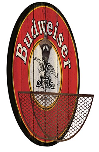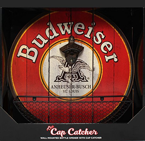 Budweiser Beer Wall Mounted Bottle Opener With Cap Catcher, Anheuser-Busch Logo, Rustic And Distressed Cast Iron Bottle Opener, Wire Metal Basket To Catch Bottlecaps
