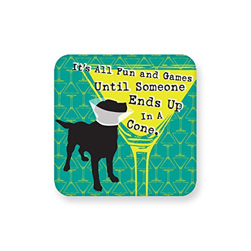 - Coasters have the text, "It's all fun and games until someone ends up in a cone", on one side and a martini glass design on the other