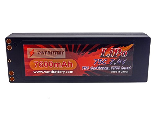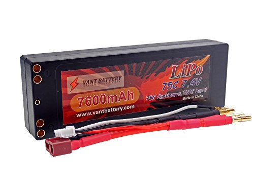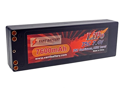 Features: True Capacity and C-Rating Dual 4mm Bullet Output Leads for Continuous High Current Draw Thick 12AWG Discharge Leads Durable Hard Case Deans Ultra Connector JST-XH Balance connector 4mm Bullet Leads Capacity: 7600mAh Voltage: 2S /?2 Cell / 7.4v Discharge Rate: 75C Constant (570A) / 150C Burst (10 sec) (1140A) Charge Rate: 2C (14.4A) Watt Hours: 56.24 Wh Weight: 11.1oz / 315g Weight w/ Wire Plug: 12.0oz / 340g Dimensions LxWxH: 138.7 x 46.5 x 24.7 mm Discharge Plug: Deans Ultra Connector Balance Plug: JST-XH Includes: 7.4V 7600mAh 2S Cell 75C-150C HardCase LiPo Battery Pack w/ 4mm Bullet Deans Ultra Connector Vant Battery Warranty w/ Lifetime Replacement Plan Equipment Needed: LiPo Balance charger capable of charging 2 cell LiPo batteries Equipment Recommended: LiPo Safe Charging Bag/Sack/Pouch, Cell Voltage Reader Safety Notes Warnings: LiPo batteries are potentially hazardous. Improper usage can cause fire or explosion. Charge and Store battery in LiPo-Safe Bag away from flammables on a concrete surface. Charge using a LiPo compatible Balance Charger ONLY! Never Charge above 4.2V per cell. Never Discharge below 3.2V per cell. Always use under adult supervision. The end-user is fully responsible for any results in using this battery pack. 0 |