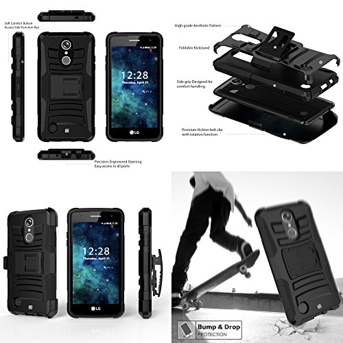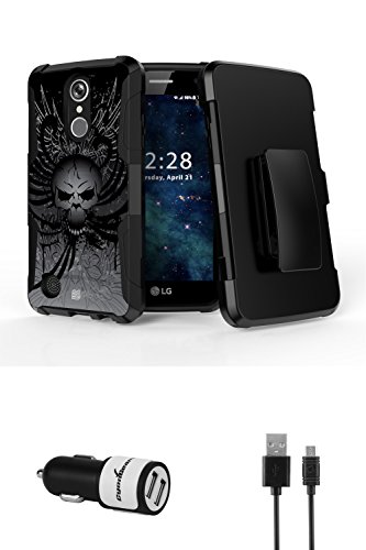 LG Aristo - Accessory Bundle with [Skull Wings] Rugged Kickstand Armor Case & Belt Holster, Atom LED and High Power 10W / 2.1A Dual Port Car Charger with Micro USB Cable [4 ft.]