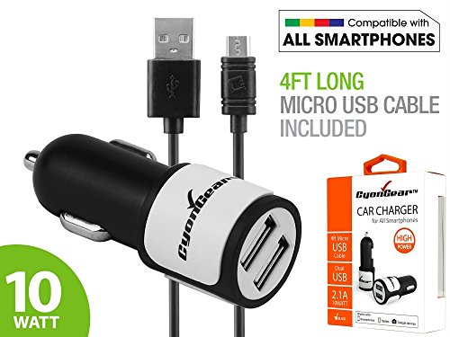 Car charger features 10 Watt (2.1 amps) / (2,100 mAh Output), dual USB ports. Input: 100-240V AC Output: DC 5V 10 Watt (2.1 Amps). Detachable 4ft. micro USB cable has slim connector that will fit most cases. Built-in Smart chip technology to prevent overcharging, overheating and overcurrent
