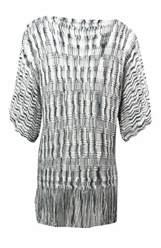 Product DescriptionSweater features knit acrylic fabric, scoop neck, short sleeves, fringed hem and pull over style.0