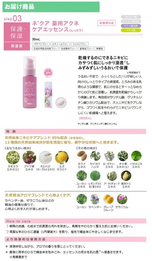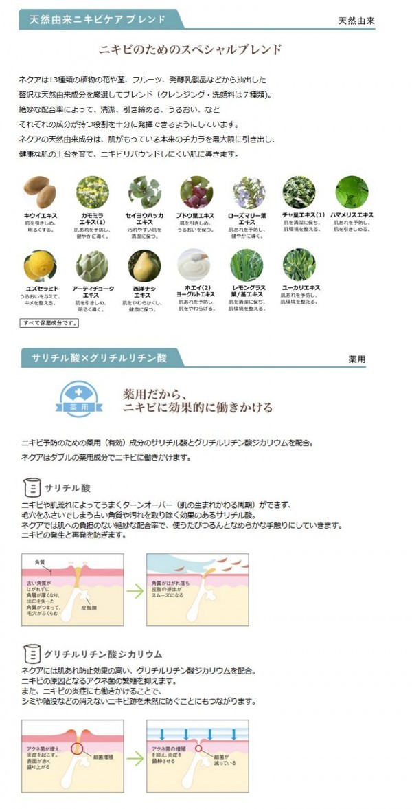| 成分 | サリチル酸、グリチルリチン酸ジカリウム その他の成分:精製水、植物性スクワラン、セイヨウハッカエキス、セイヨウナシ果汁 発酵液、ホエイ(2)、カモミラエキス(1)、キウイエキス、ユーカリエキス、ユズセラミド、チャエキス(1)、アーティチョークエキス、ローズマリーエ キス、ハマメリスエキス、レモングラス抽出液、ブドウ葉エキス、マカデミアナッツ油、オレンジラフィー油、天然ビタミンE、キサンタンガム、d-δ-トコ フェロール、水素添加大豆リン脂質、13-ブチレングリコール、濃グリセリン、ラベンダー油、香料、クエン酸ナトリウム、クエン酸、セタノール、ポリオキ シエチレンメチルグルコシド、親油型モノステアリン酸グリセリル、パルミチン酸セチル、12-ペンタンジオール、ジエチレントリアミン五酢酸五ナトリウム 液、フェノキシエタノール |