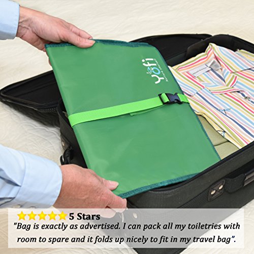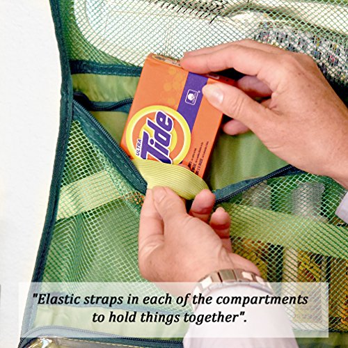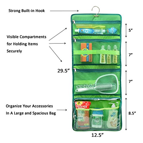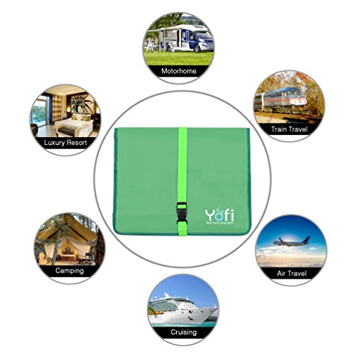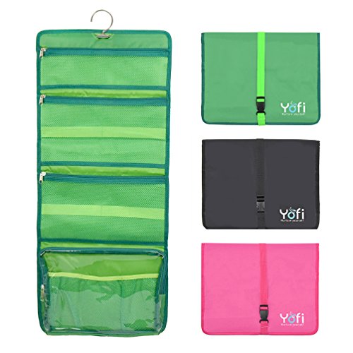 - QUALITY DESIGN: With a stainless green Polyester backing and four zippered pockets that have three with mesh holders and one with clear see-through vinyl; the YOFI NUTURE HANGING TOILETRY BAG will last a long time; two of the pockets have green elastic bands for holding items securely in place without spilling, even if the section is left open; the long panel can be folded up into a small pouch with its adjustable closing strap to fit in a suitcase or carry bag when traveling;
