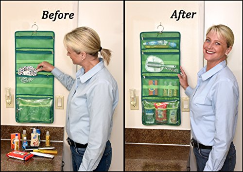 Hanging Toiletry Bag by Yofi Nurture Yourself: Organizer for Cosmetics, Makeup, Jewelry, Toiletries, Shaving Tools in Green Expandable, Polyester Case with Zippers and Sections for Home or Traveling