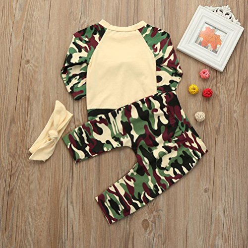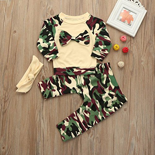 Happy Shopping Start From Here --- Efaster Features: ♪1.It is made of high quality materials,Soft hand feeling, no any harm to your baby's skin ♪2.Fashion style long sleeve suit for baby, comfy baby clothes ♪3.Camouflagemake your baby more fashion, lovely and cute ♪4.Great for?casual, Daily,?party?or photoshoot, also a great idea for a baby outgoing ♪Product information: ♪Gender:Girlsboys ♪Material:Cotton blend ♪Clothing Length:Regular ♪Pattern Type:Camouflage ♪Decoration:Bowknot ♪Sleeve length:Long sleeve ♪Collar:O-Collar ♪Style:Occident ♪Occasion:Casual ♪Package include:1PC Tops 1PC Pants 1PC Headbands ♪Both hand wash and machine wash is OK ♪Please note that slight color difference should be acceptable due to the light and screen. ♪Size Chart For Baby (Unit:cm/inch/1 inch = 2.54 cm) ♪Size:6M-- Label Size:70-- Bust:46CM/18.1"-- Tops Length:31CM/12.2"-- Pants Length:36CM/14.2" Height:70CM ♪Size:9M-- Label Size:80-- Bust:50CM/19.7"-- Tops Length:33CM/13"-- Pants Length:38CM/15" Height:75CM ♪Size:12M-- Label Size:90-- Bust:54CM/21.3"-- Tops Length:35CM/13.8"-- Pants Length:40CM/15.7" Height:80CM ♪Size:15M-- Label Size:100-- Bust:58CM/22.8"-- Tops Length:37CM/14.6"-- Pants Length:42CM/16.5" Height:85CM 0