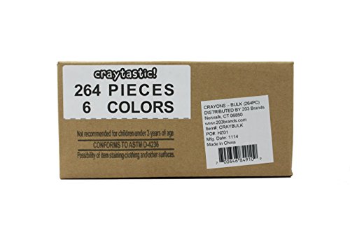 You will receive (1) Package of Craytastic! Bulk Crayons which contain 264 crayons per package. The package contains an assorted set of six different colors (Red, Orange, Yellow, Green, Blue, Purple). The crayons measure 3.5 inches in size, are non-toxic, premium quality and fully safety tested for kids 3 & up! Fun for kids in school, daycare, restaurant, doctor's office, hair salon, etc. Our crayons conform to Safety Standard ASTM D-4236 and have been tested to meet LHAMA (Labeling of Hazardous Art Materials Act) compliance and are free from Lead, Phthalates and Asbestos! Also great for melting and using in silicone molds such as our Traytastic brand baking and craft molds!Feature