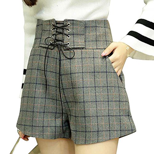 -. Title : (ノーブランド品) ショートパンツ ハイウエスト チェック グレンチェック レースアップ 編み上げ ボトムス パンツ 秋 冬 レディース