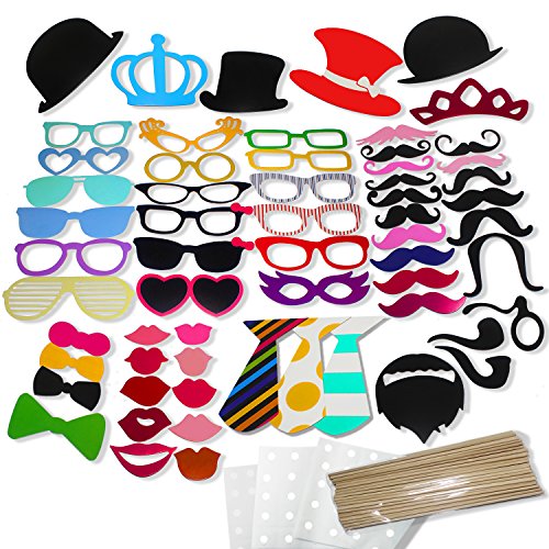 -. Feature : Various choices: This 60 pieces set gives you different kinds of props and limitless creative combinations, which make you laugh aloud and never make you feel bored / Party Essentials: These photo booth props will create a lot more fun & laughter on friends gathering and family reunion parties. Great to take a nice picture and always remember your joyous time on birthday, Christmas and New Year Parties / Material: This DIY Kit is P.R.Inted with durable thick cardstock in vivid colors, exactly as shown in the product images / Easy to Install: Come with more than enough glue dot sheets and wooden sticks, which are brought to you to attach the props easily and prevent them from automatically falling off