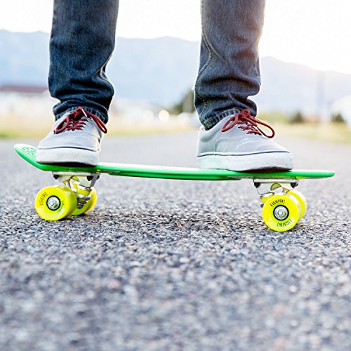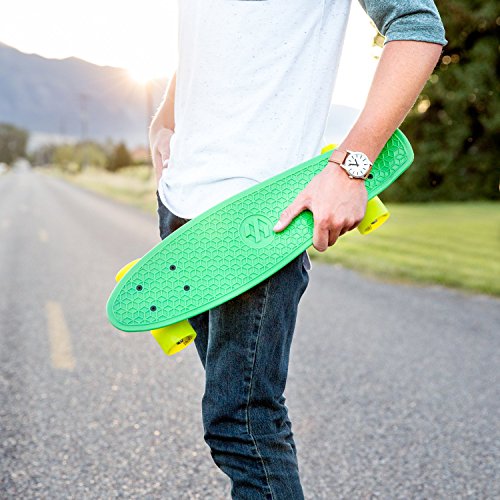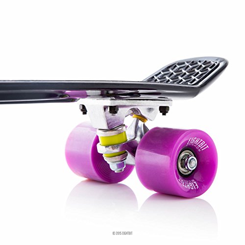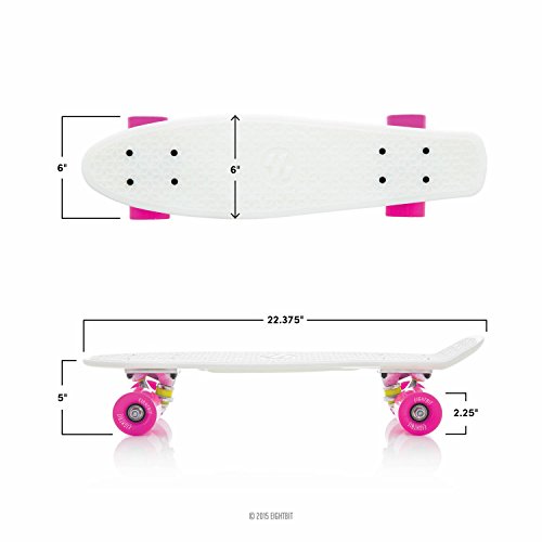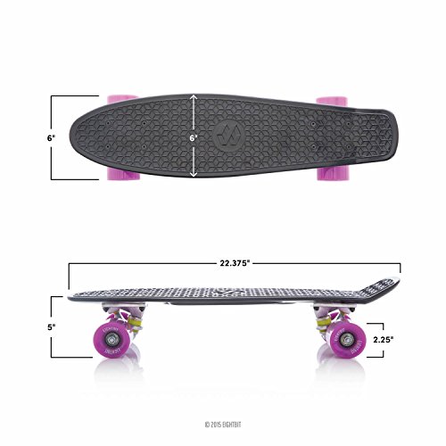 -. Feature : 6 inch x 22 inch Retro-style waffle-grip plastic deck / 3 inch wide aluminum trucks / 59mm 82a Urethane-cored super smooth EightBit wheels / ABEC-7 High speed precision stainless steel bearings / Board includes a high-tensile allen key