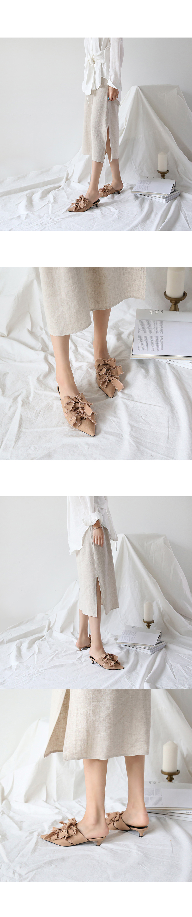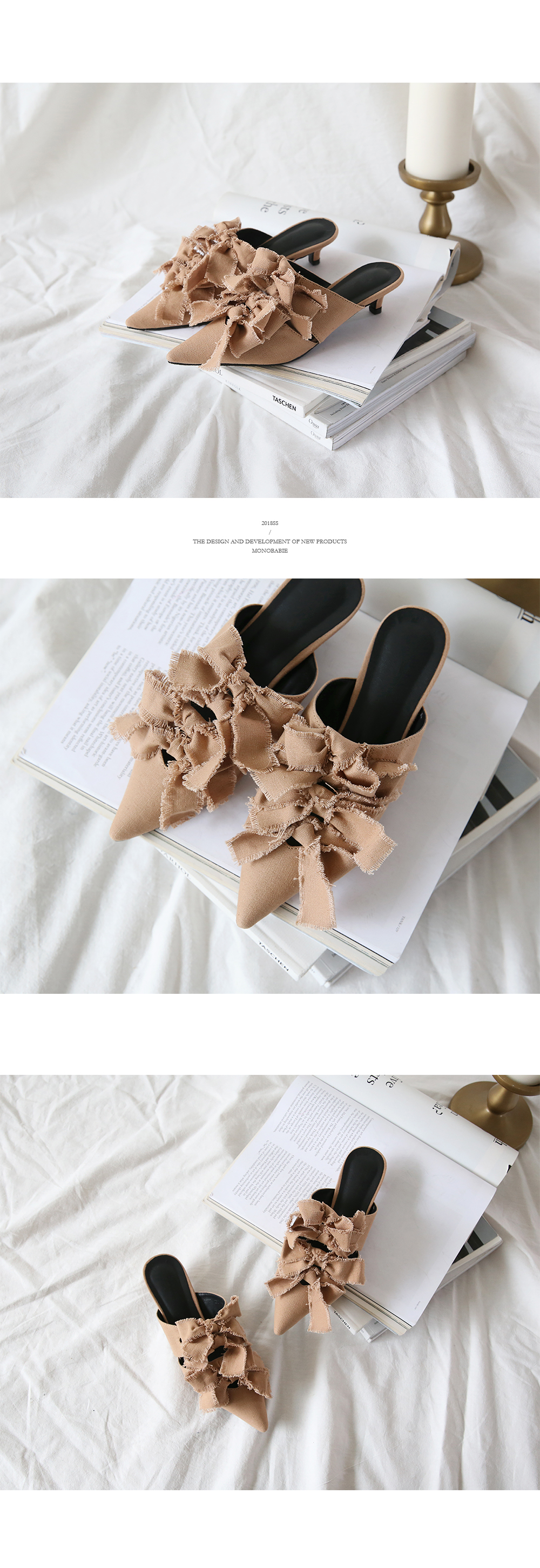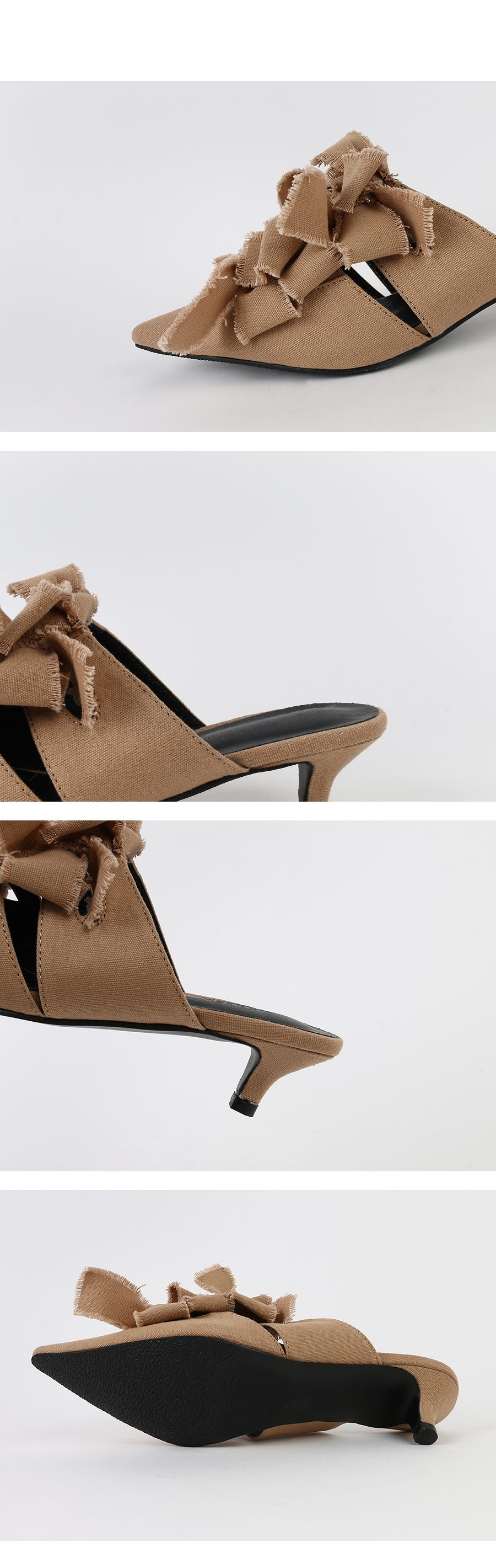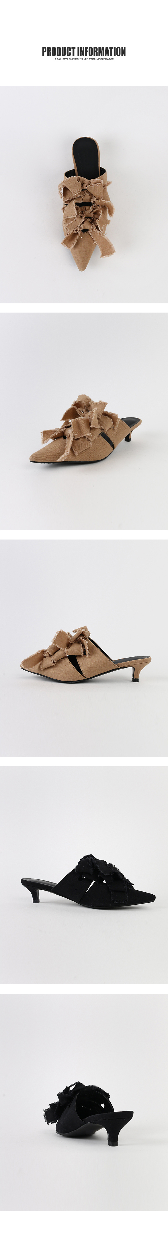 스틸레토쉐입의 뮬입니다. 나이프처럼 날카로운 쉐입이 보여지는 제품으로 적당한 키튼힐이 더해져 트렌디하게 연출됩니다. 발등에 동일한 소재로 리본을 더해주었으며 마감하지않은 데끼디테일이 네츄럴합니다. 지금부터 초가을까지 즐겨도 좋은 아이템입니다.