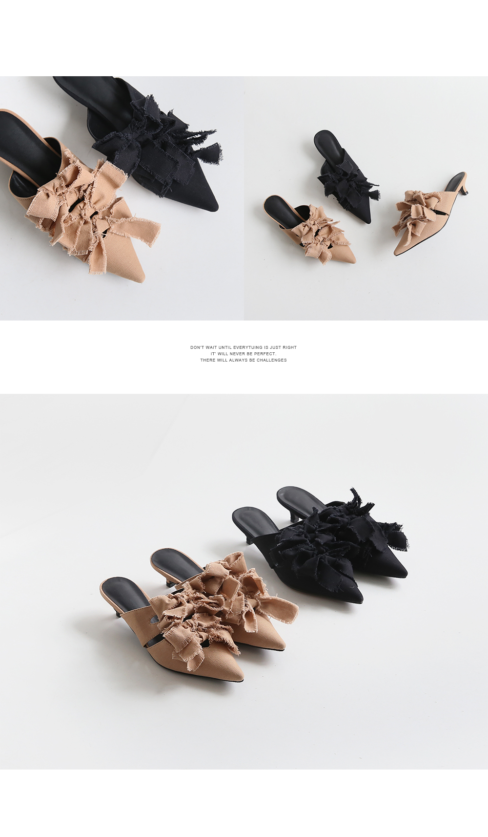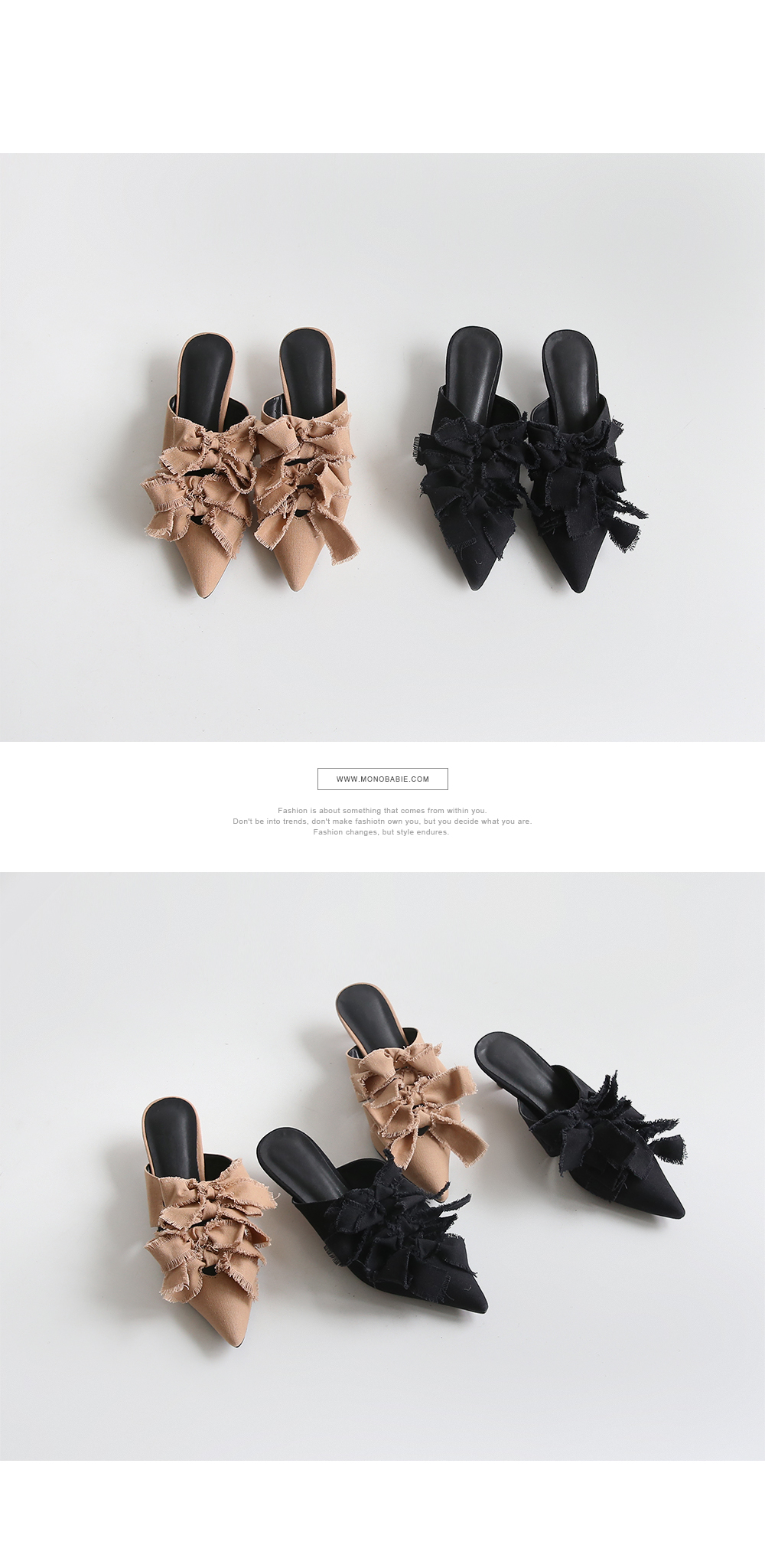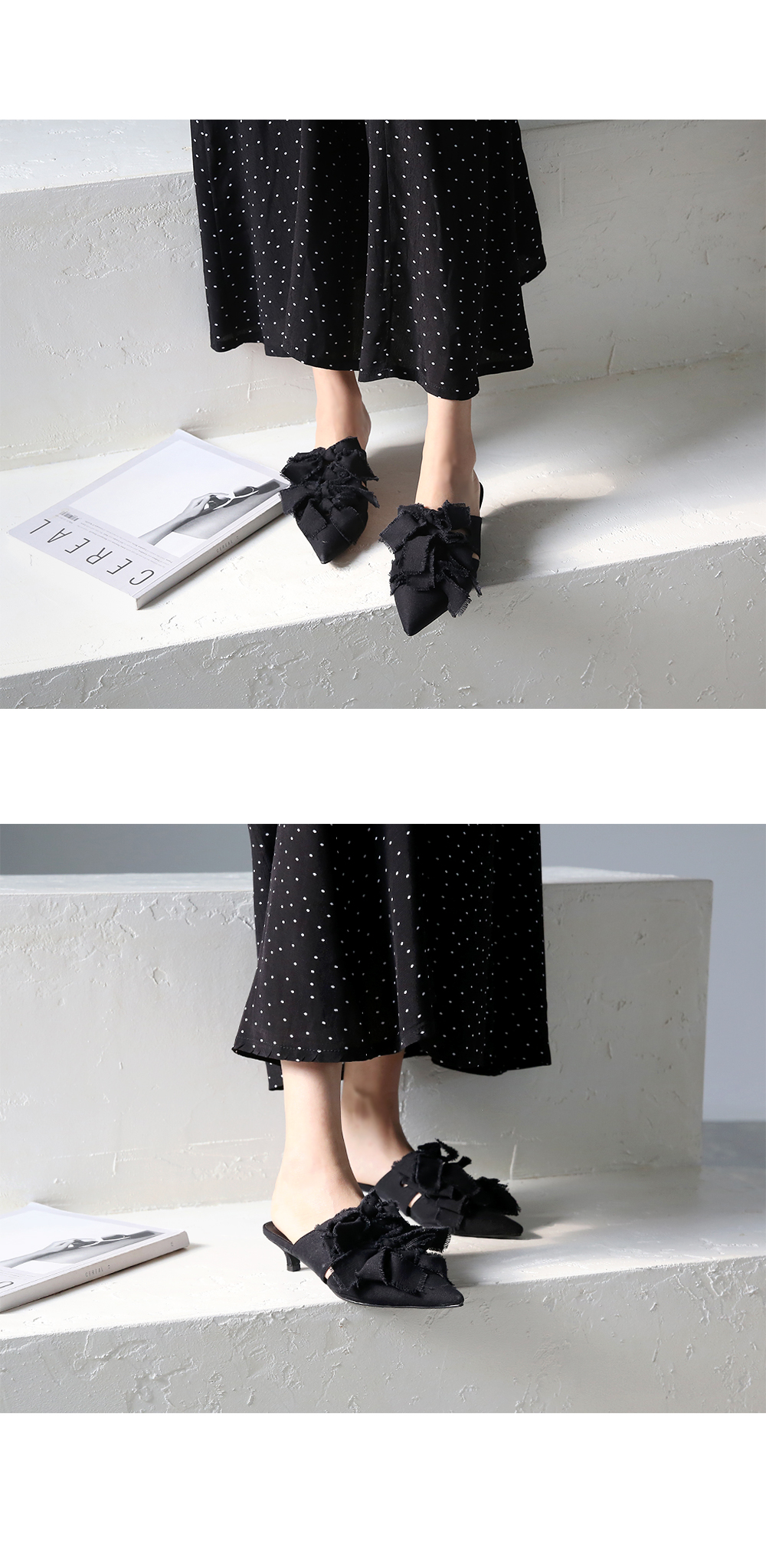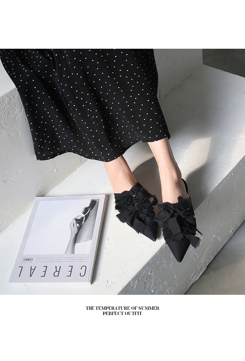 스틸레토쉐입의 뮬입니다. 나이프처럼 날카로운 쉐입이 보여지는 제품으로 적당한 키튼힐이 더해져 트렌디하게 연출됩니다. 발등에 동일한 소재로 리본을 더해주었으며 마감하지않은 데끼디테일이 네츄럴합니다. 지금부터 초가을까지 즐겨도 좋은 아이템입니다.