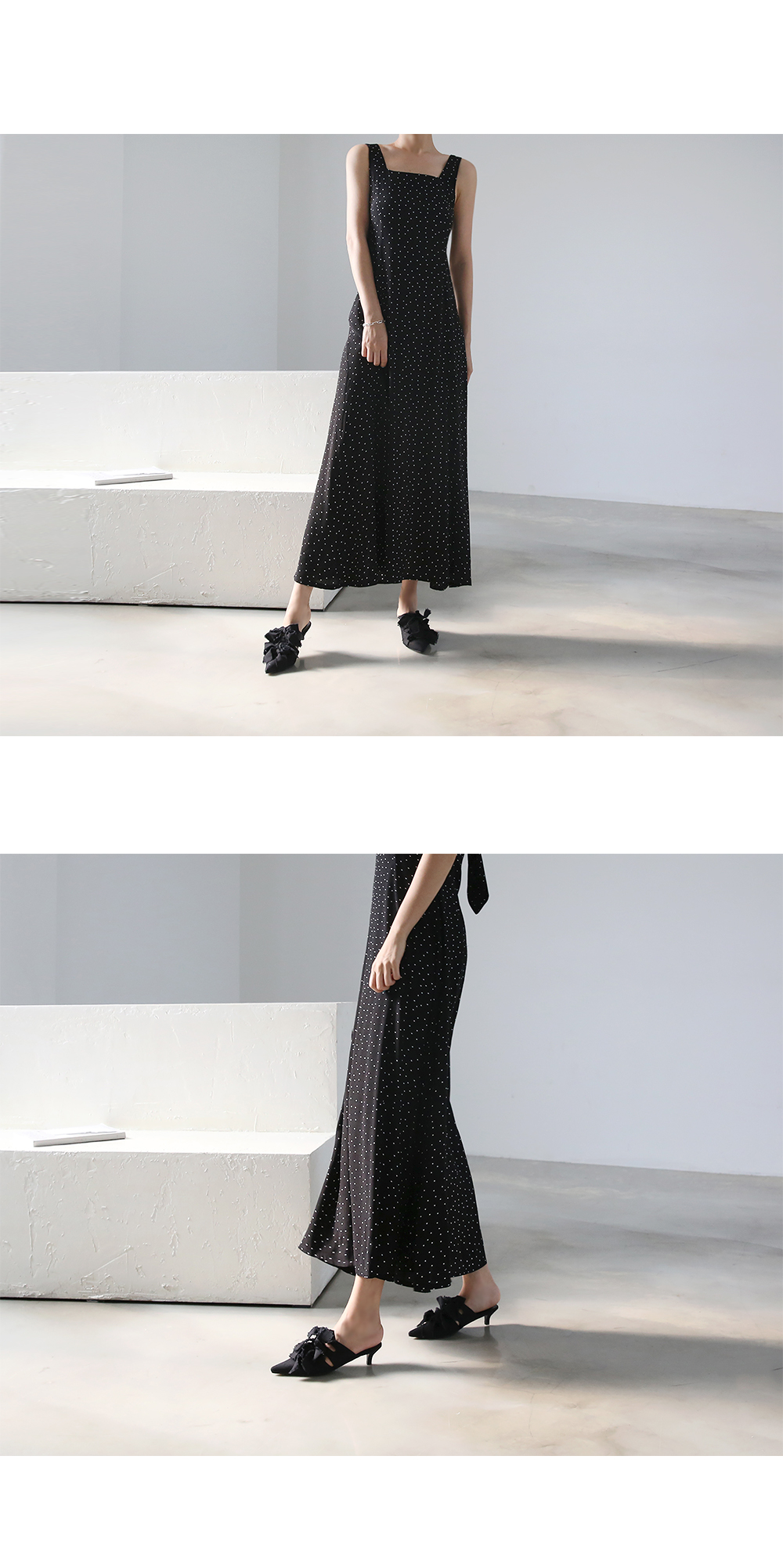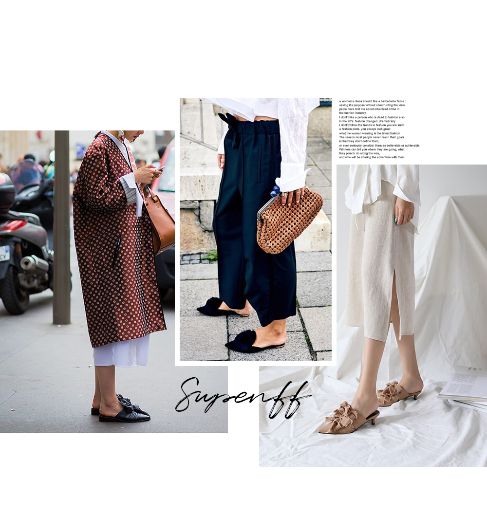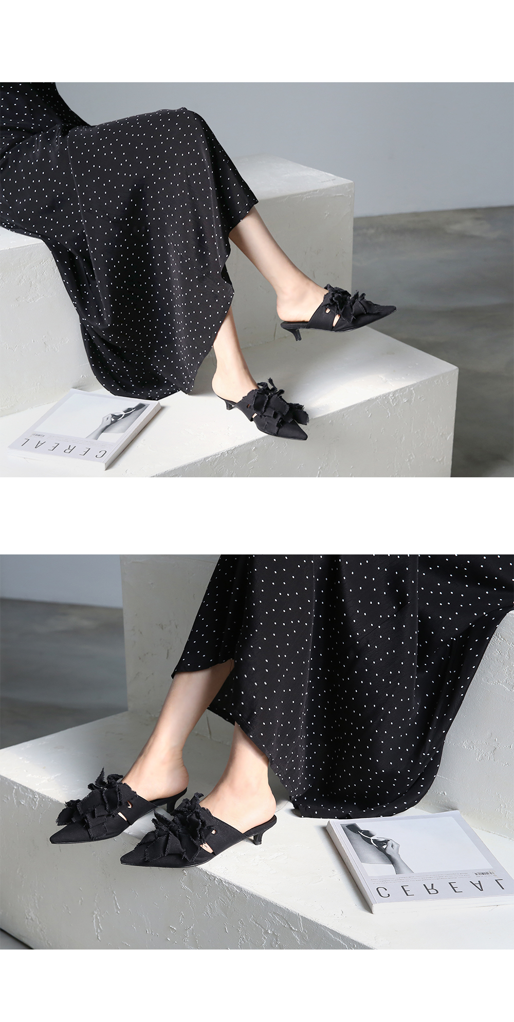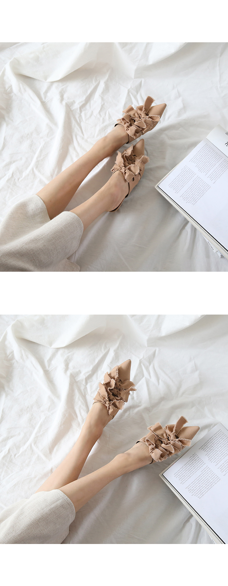 스틸레토쉐입의 뮬입니다. 나이프처럼 날카로운 쉐입이 보여지는 제품으로 적당한 키튼힐이 더해져 트렌디하게 연출됩니다. 발등에 동일한 소재로 리본을 더해주었으며 마감하지않은 데끼디테일이 네츄럴합니다. 지금부터 초가을까지 즐겨도 좋은 아이템입니다.