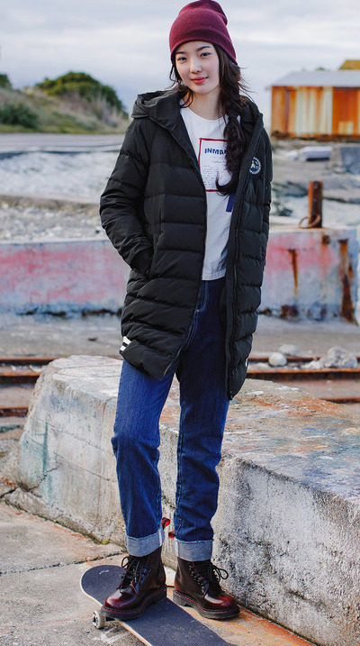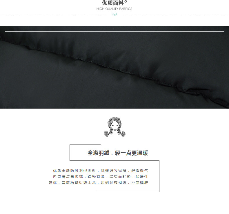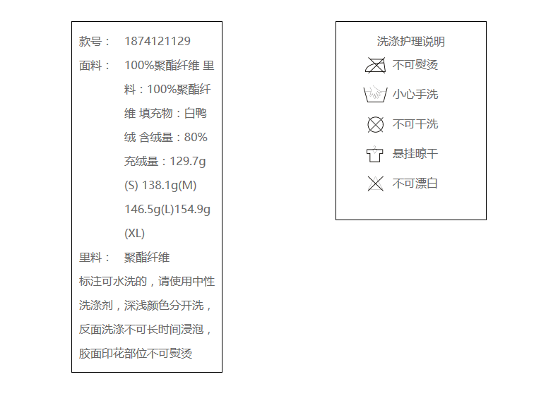 100%聚酯纤维 里料:100%聚酯纤维 填充物:白鸭绒 含绒量:80% 充绒量:129.7g(S) 138.1g(M)146.5g(L)154.9g(XL)